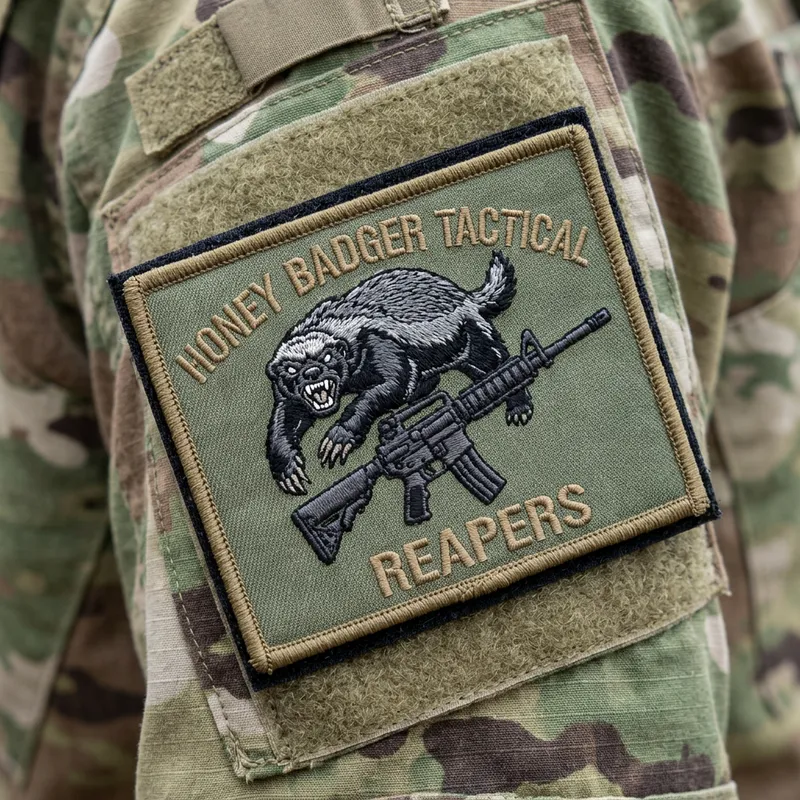 Generate an image with an animal and a weapon for a Velcro patch on a uniform.