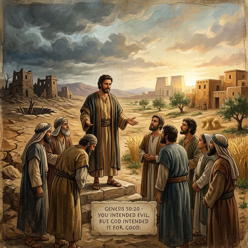 Illustrate an abstract scene inspired by Genesis 50:20. The image has a biblical atmosphere, probably a desert scene filled with ancient architecture in the background. In the center, there's a figure symbolizing Joseph, portrayed as a Middle Eastern man in ancient clothing, conveying a message of hope and resilience to a group of diverse individuals, symbolizing his brothers. The environment around them is changing, signifying trial turning into triumph, hinting at evil plans being transformed into good purposes.