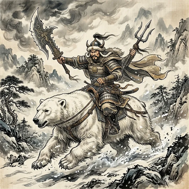A Mongolian leader from the 13th century, donned in traditional armor, swiftly riding a large polar bear. In his right hand, he wields a menacing ancient weapon while holding a trident in his left hand. The scenery around him reflects the dramatic dynamism of this unusual sight. Render this scene in the style of traditional Chinese artistry, highlighting details with soft brushes, swirling inks, and the ethereal elegance of historical East Asian aesthetics.