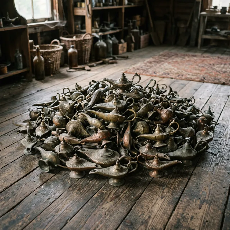 Genie's lamps in a pile on wooden plank floor