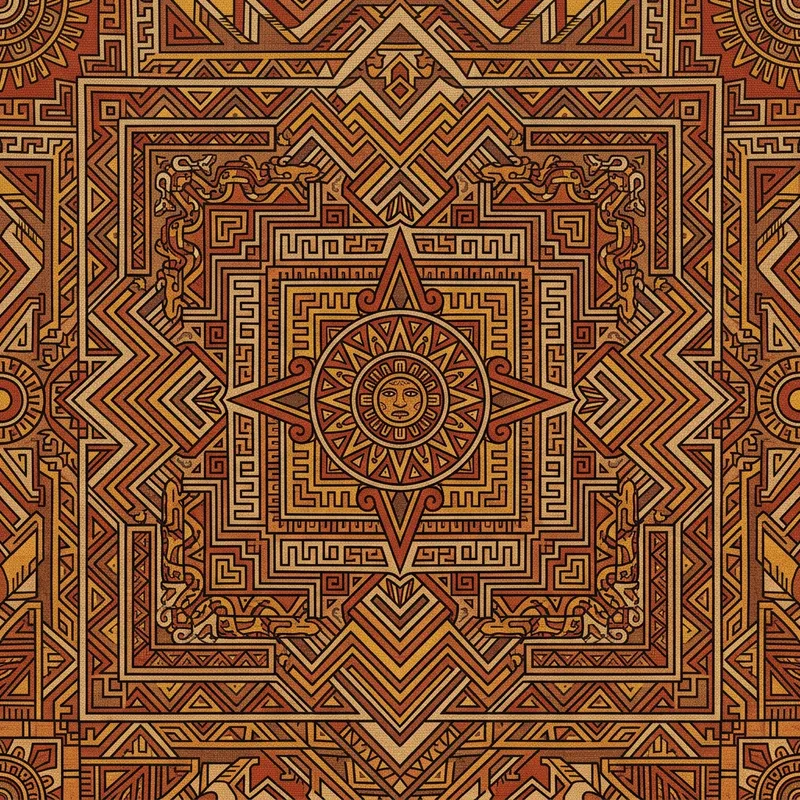 Create a seamless texture with intricate Aztec patterns. The patterns should be geometric and symmetrical, featuring detailed shapes and lines common in traditional Aztec art. The color scheme should reflect earth tones such as browns, reds, and yellows. Please ensure the design can be tiled to form a larger pattern without visible seams.