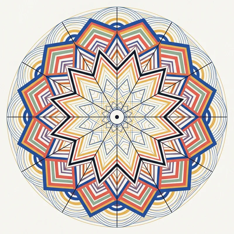 Create a minimalist design featuring a harmonious combination of geometric patterns arranged in a circular form, originating from the centre. The design should provide a clear sense of rhythm through balanced and symmetrical elements. Use variation in line thickness to create an illusion of depth. For visual allure, employ a tasteful mix of primary colors, like red, blue, and yellow, in harmony with their complementary shades. The colors should not overwhelm each other, instead all contribute to creating a visually compelling and harmonious geometric design.
