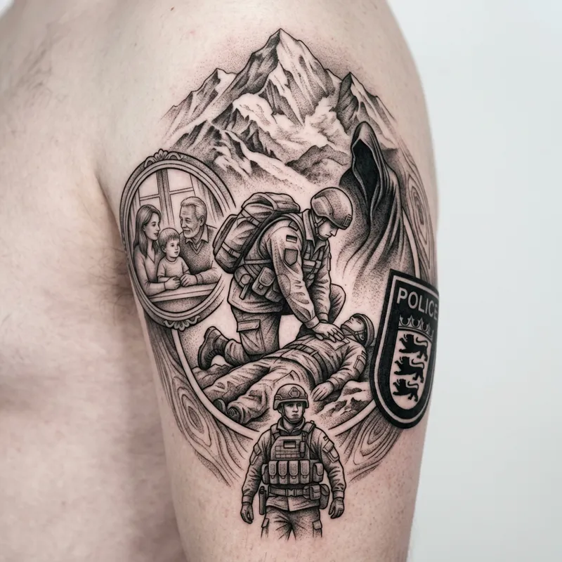 An image of a monochromatic tattoo on a light background. The theme of the tattoo consists of various elements. First, a German medic in an overseas mission, engaged in a life saving act while shrouded by the looming shadow of death. Second, a representation of mountains, symbolizing the environment where these medics often operate. Third, family, represented in the form of heartwarming scenes of loved ones waiting back home. Fourth, an emblem of the police from Baden-Württemberg. Fifth, a manifestation of woodworking, which might signify a cherished hobby. Lastly, a figure of a brave soldier, hinting at resilience and determination.