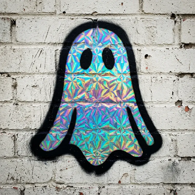 A stencil of a ghost, captured in stark black and white contrast. The ghost appears enveloped by a sheet, creating an intriguing mix of defined, solid outline, and interior nuances. The inner part of the sheet, however, breaks from the monochrome, boasting a stunning holographic design that complements and contrasts with the black and white.
