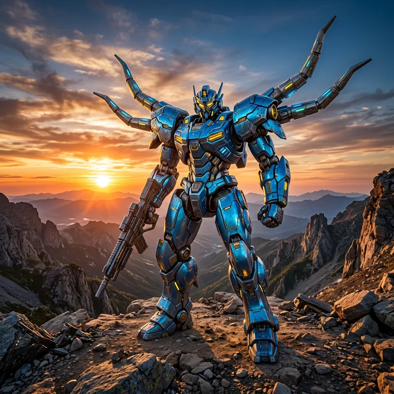 Create an image of a giant mech robot, with shimmering blue metal armor and yellow accents. It has long, four-pronged protrusions from its shoulders that are reminiscent of horns. The robot is in a heroic pose on a rugged terrain as if ready for a battle, with a far-off sunset on the horizon behind.