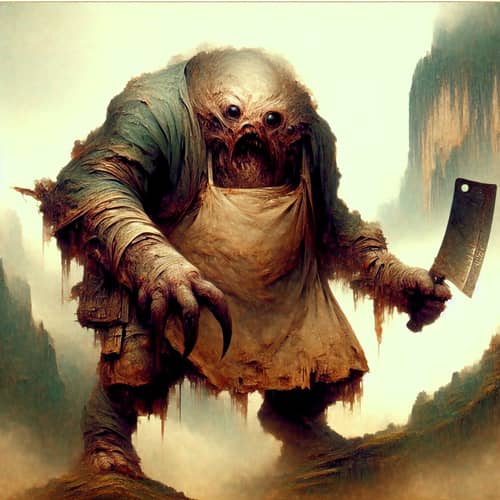 Create a detailed image of a giant mythical creature, a towering figure with thick, green skin, several times taller than the nearby structures. The creature is standing in a quaint, small town with cobblestone streets, half-timbered houses, and a charming clock tower. Visibly distressed townsfolk of mixed descent and gender can be seen running and hiding. Cloudy skies loom overhead, matching the tension-filled atmosphere. No physical harm is depicted in the scene.