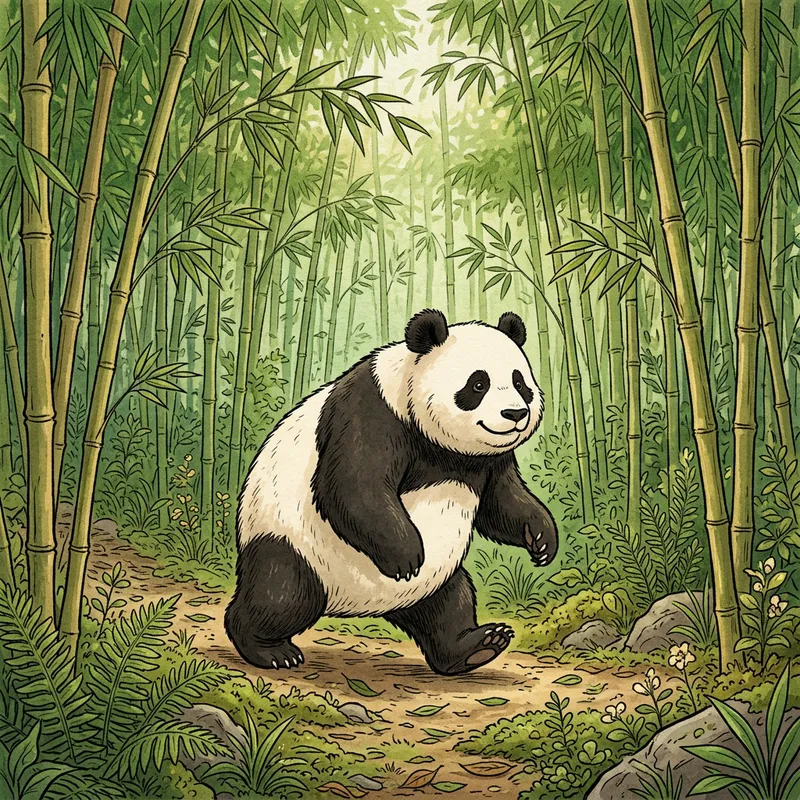 Illustration of a giant panda strolling in a bamboo forest, in a two-dimensional style