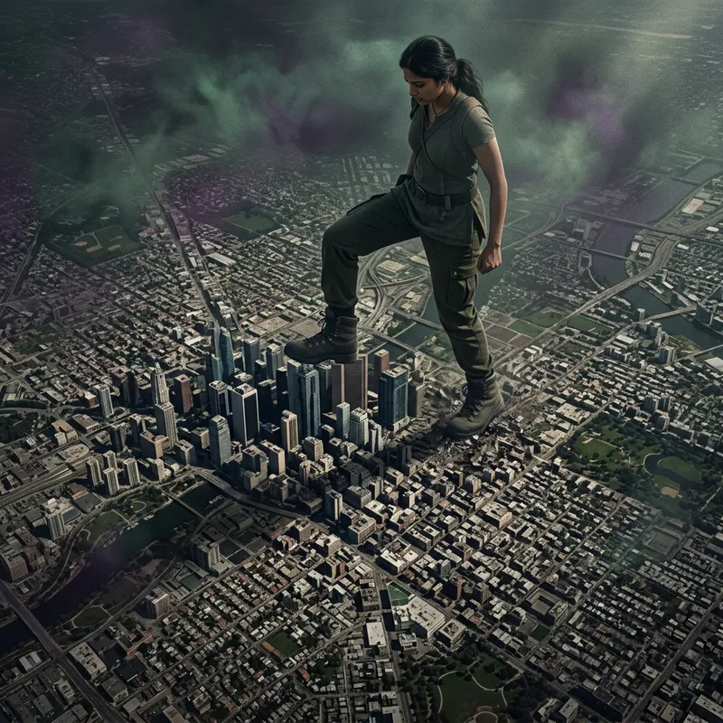 Picture a tall, physically fit, and adventurous South Asian woman, dressed as a giantess, towering over a cityscape that's barely visible due to a wicked spell. The magic has transformed her into a colossal and commanding creature. With her right foot raised, she is ready to destroy the city beneath her. Visualize the scene from a satellite's perspective, portraying the woman from a significant distance above as she brings about destruction. The image, created using the principles of diffusion, should evoke a gloomy and menacing atmosphere, incorporating a blend of subdued color tones and dramatic illumination. Imagined as a shot from a high-resolution satellite camera, it highlights the grand scale and intensity of the woman's transformation. This dreamlike depiction merges elements of fantasy, action, and devastation.