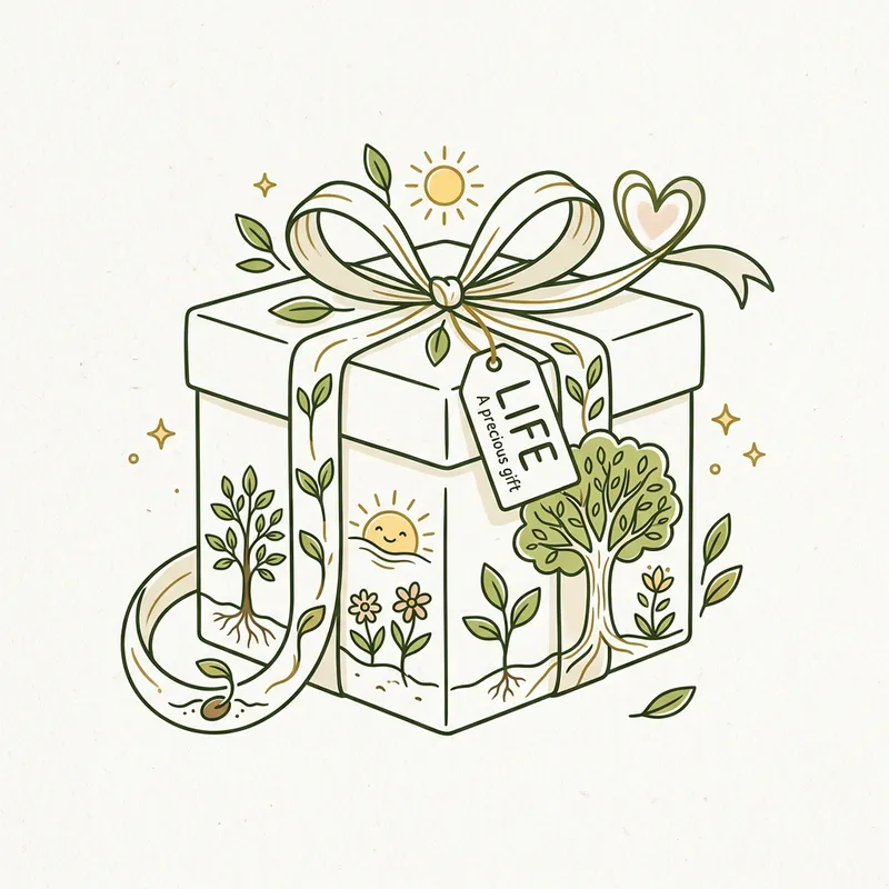 Create a simple, gift-shaped drawing that communicates the importance of life. The gift box should be decorated with symbols of growth and vitality, such as images of trees, flowers, or the rising sun. Its ribbon could artistically weave in symbols representing the life cycle, like a small seed growing into a large tree. The overall design should exude positivity, growth and the preciousness of life, in a minimalist style.