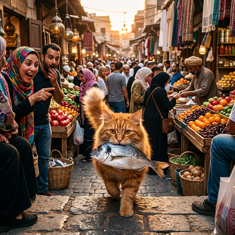 A fluffy ginger cat with shining amber eyes stealthily making its way through a bustling market. The cat, with a whiskered grin, is carrying a large fish in its mouth. Stalls around the market are overflowing with an array of fruits, vegetables, and assorted goods. Shoppers with diverse appearances hint at a multicultural locale. Some are astonished, pointing at the thieving cat, while others remain oblivious, engrossed in their own buying and selling. The atmosphere is enriched by the yellows and oranges of the setting sun highlighting the ginger color of the cat.
