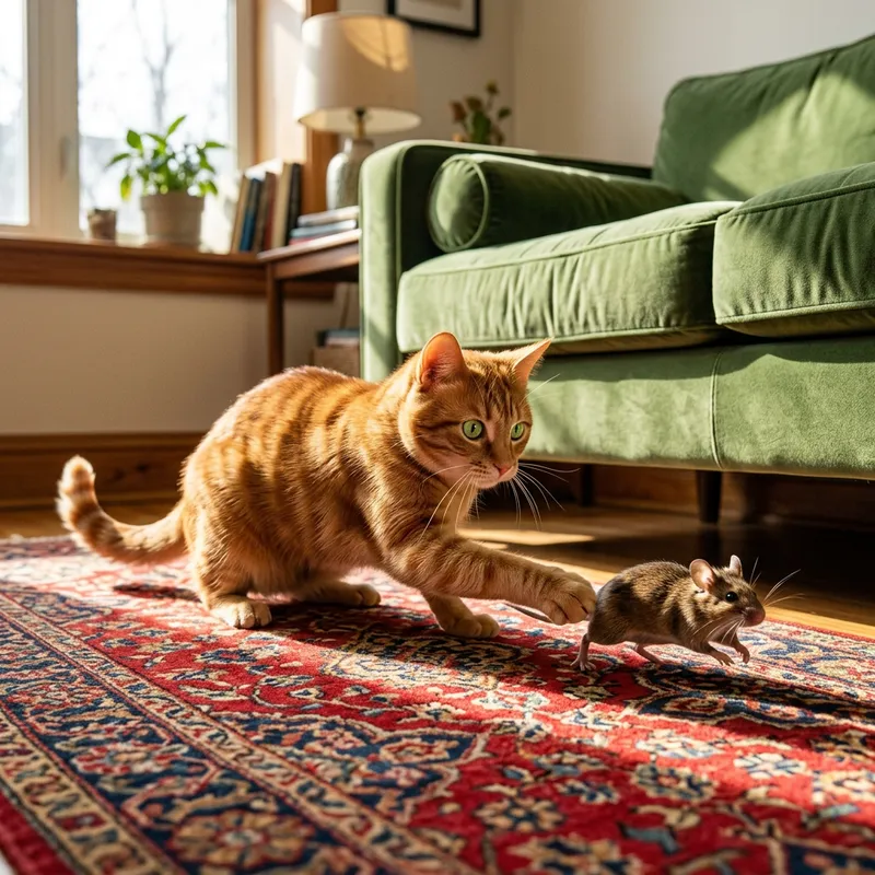 A playful scene in which a ginger domestic cat with bright green eyes is teasing a small, brown mouse with its paw. The mouse is trying to escape, looking anxious yet determined. They are in a typical living room setting with a red Persian rug on the floor and a green velvet sofa in the background. Sunshine floods the room through a large window, casting long shadows and bright highlights.