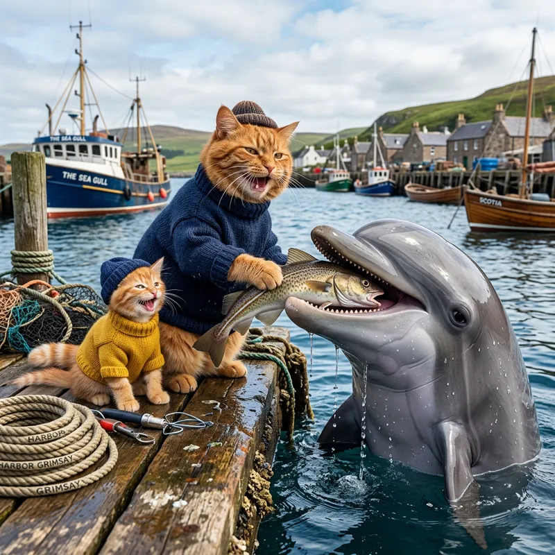 A ginger Scottish tomcat and his kitten son are sitting on a sea dock, feeding a large fish to an even larger dolphin. They are grinning at each other cheerfully. These adorable cats are dressed like fishermen, laughing joyously. The dolphin also has a smile on its face. The image is portrayed in a close-up style. The art style requires a high degree of realism, hyperrealism, and photorealism. It should also be professional, aesthetically pleasing, beautiful, realistic, and high resolution.
