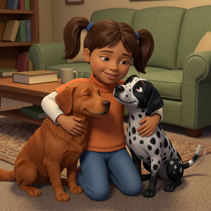 Girl Embracing Dogs in Modern Animated Style