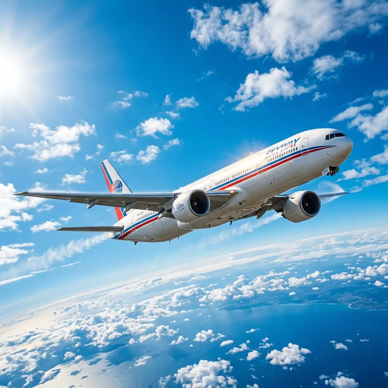 A detailed image of an airplane flying through the bright blue sky. The airplane is painted in gleaming white and features red and blue stripes along the body. It has big jet engines hanging under the wings. The wings are spread wide, cutting through the air as the plane soars higher. The sky is clear with only a few fluffy white clouds scattered, creating a breathtaking view of the vast stretch of blue. The sun is seen in the distance, its rays reflecting off the airplane's exterior like a beacon of light ushering in a new day.