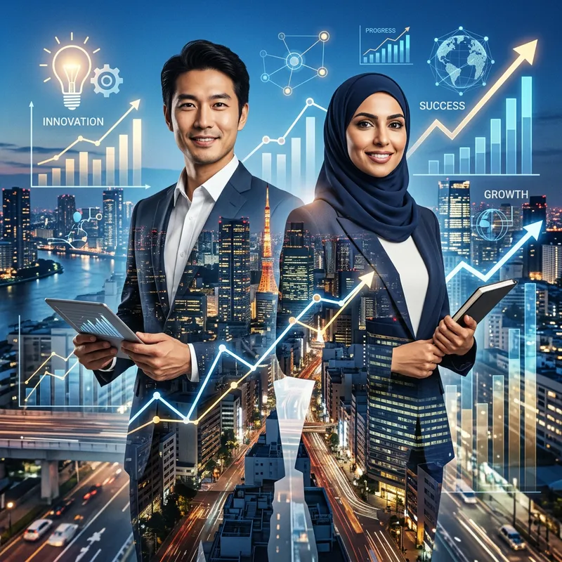 A double exposure image showcasing an East Asian businessman and a Middle Eastern businesswoman standing confidently. This image overlays with a bustling cityscape view, filled with towering skyscrapers and vibrant life. To further encapsulate the thriving enterprise, the scene is interspersed with abstract representations of business charts, graphs, and symbols of innovation, all casting a theme of growth and progress.