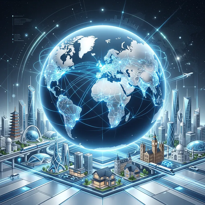 Imagine a visual representation of global expansion. It could be a dynamic image of a 3D globe, with lines of connectivity expanding outward, reaching every landmass on the planet. Add on this visual display, some elements of modern and sleek design: clean lines, smooth shapes, a refined color palette consisting of cool silvers, tranquil blues, and crisp whites. Around the globe, there could be some simple, minimalist structures that represent super modern and high-tech cities, showcasing the technological advancements and connectivity that global expansion brings. Make sure the cities have diverse architecture, from skyscrapers to traditional houses, representing different cultures harmonized by globalization.