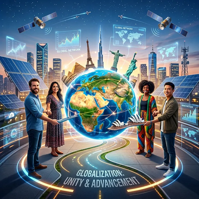 Show a symbolic representation of globalization in the contemporary world. Visualize a spherical globe representing Earth, with different notable landmarks from around the world such as the Egyptian pyramids, the Eiffel Tower, the Great Wall of China, and others, intermingling seamlessly to show global unity. Feature individuals of different genders and descents, such as a Caucasian man, a Hispanic woman, a Black woman, and an Asian man, holding hands around the globe, symbolizing global collaboration and unity. Ensure that the background includes futuristic elements indicating technological advancement like satellites, solar panels, and holograms to represent the role of technology in globalization.