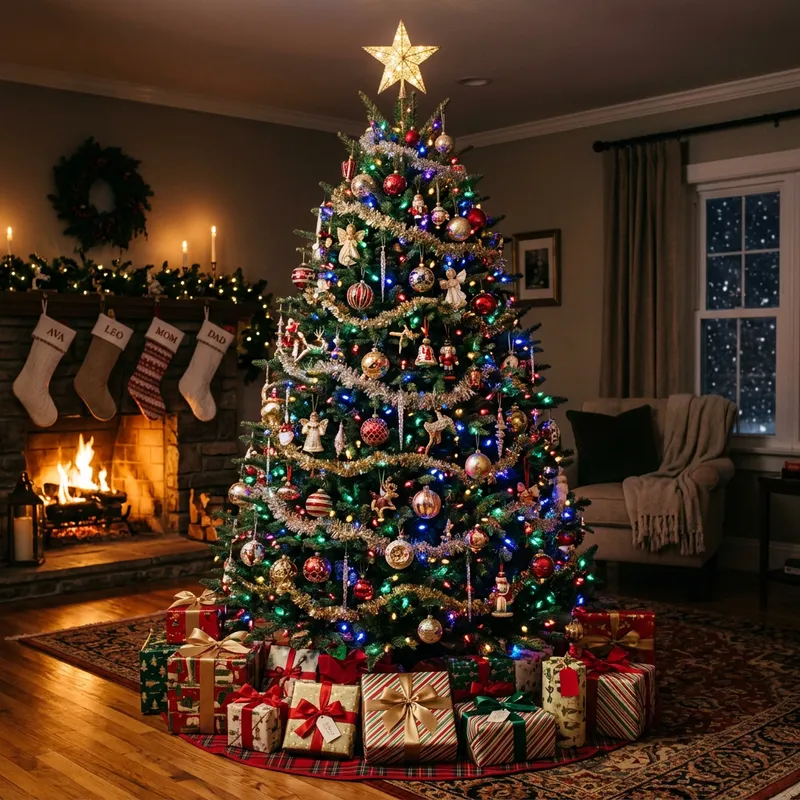 Glowing Christmas Tree with Colorful Lights and Ornaments