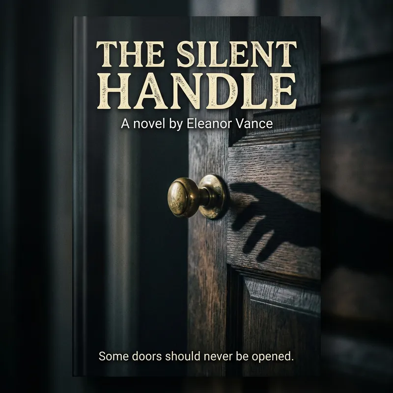 Generate a book cover created with a focus on a door handle and a shadow of a hand about to open the door.