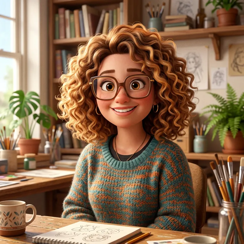 Generate a 3D Pixar cartoon image of a woman with light curly brown hair and some blonde (golden red) highlights, large square brown glasses with a golden touch on top, a slightly puffy face, and a slightly matte complexion.