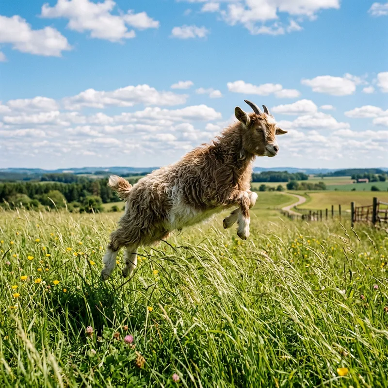 A picture of a whimsical scene on a sunny day. An agile, adorable goat with a shaggy coat of fur and small curved horns, caught in a playful leap mid-air, giving the illusion of flight. Tall, vibrant green grass swaying gently in a field, casting intermittent shadows on the goat. The azure sky stretching endlessly above, punctuated by cotton candy clouds scattering the light in different directions. A sense of joy, freedom, and playfulness permeating the image.