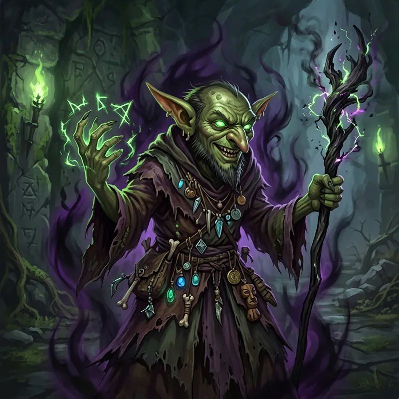 A male goblin warlock from a popular role-playing game stands in the middle of incanting a hex spell. His eyes glow with an eerie green light, highlighting his sharp features and malicious grin. He is dressed in tattered robes, adorned with various tokens and amulets, depicting his numerous victories and achievements. A shadowy aura surrounds him, augmenting his terrifying presence. The blackened, gnarly staff he clutches in his right hand seems to sputter and crackle with hidden, otherworldly energy.