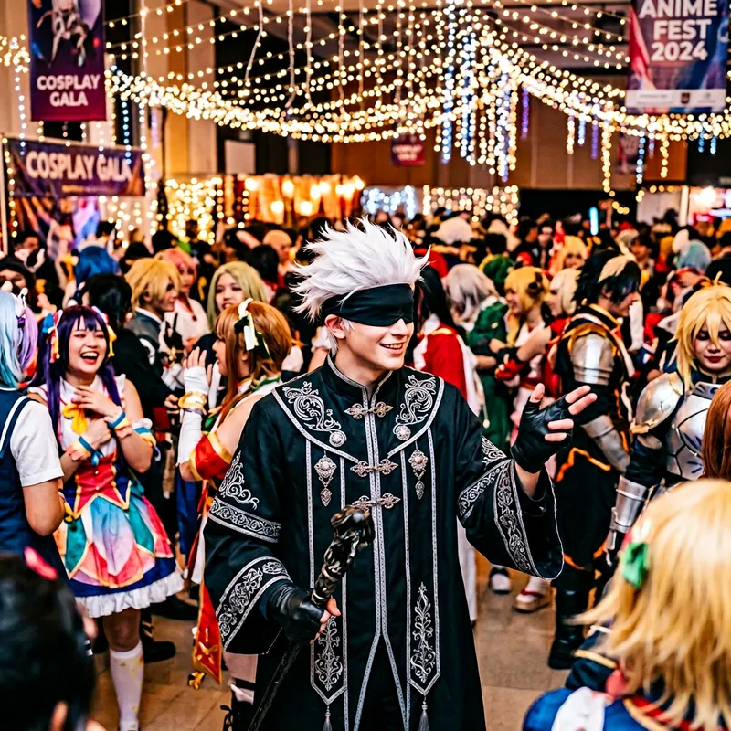 A character with striking white hair and vibrant blue eyes, wearing a distinctive costume that includes a dark academic robe with silver embellishments, a pair of dark gloves, and a black blindfold often seen in an anime called 'Magic Battle', at a lively social event. The event is filled with other attendees in various costumes, showing a wide range of vibrant colors and imaginative designs. A flurry of sparkling lights decorates the venue, and the air is filled with the excited chatter and laughter of the guests.