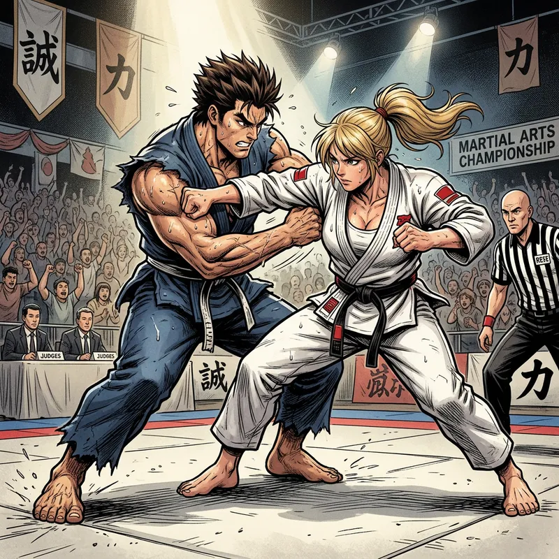 A detailed illustration depicting an intense match of strength and agility between an unnamed powerful male martial artist with spiky hair and a muscular female martial artist with blonde hair. They are mid-match, strategically positioning themselves for an upper hand.