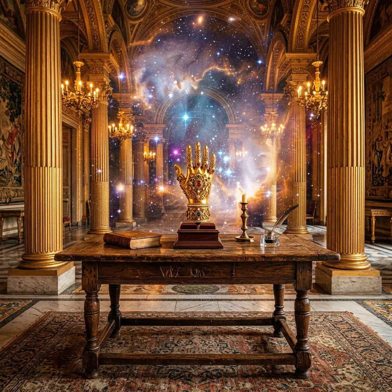 Visualize an antique old wooden table, rich in texture and history. Atop this table, a golden hand of exquisite craftsmanship is proudly displayed. Shifting focus, the room surrounding the table reveals itself to be opulent and golden, decorated by grand columns that reach towards the ceiling. The entire scene is bathed in the warm, rich glow of golden light. Transcending the realm of the ordinary, the background of this scene dissolves into a celestial dreamscape, with streaks of stars, distant galaxies, and ethereal nebulae in shades of blues, purples, and whites.