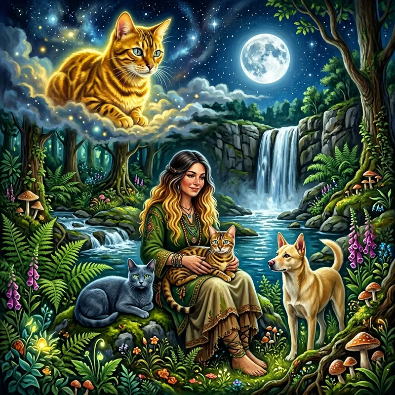 Visualize a golden Bengal cat with green eyes observing from the sky a semi-round faced shamanic woman with freckles on her face. She has long, wavy, multi-tonal hair—it's dark brown at the roots gradually fading into blonde at the ends. Seated on the woman's lap is another golden Bengal cat with grey eyes, while at her side, a Russian Blue cat with green eyes and a native breed dog with pointed ears, short blonde fur, and a pink nose keep her company. The scene envelops her with an abundance of plants, flowers, mushrooms, a river, and a waterfall. Above everything, the full moon shines brightly in the sky. The overall color palette leans toward various shades of green.