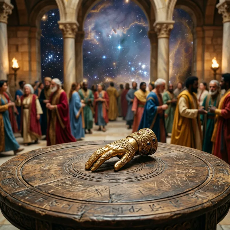 A scene capturing a close-up of a golden hand gracefully placed in the center of an ancient, round, wide wooden table. This central object is set in contrast with a room, cast in soft focus for a blurred effect, characterized by its gold-infused hues and architectural columns. The room is populated with individuals, sporting robes of various colors and textures. These human figures, representing a diverse array of ethnic backgrounds and genders, add an element of motion and life to the mise-en-scène. Finally, a celestial background encapsulates the room, offering a surreal transcendence to the entire setting.
