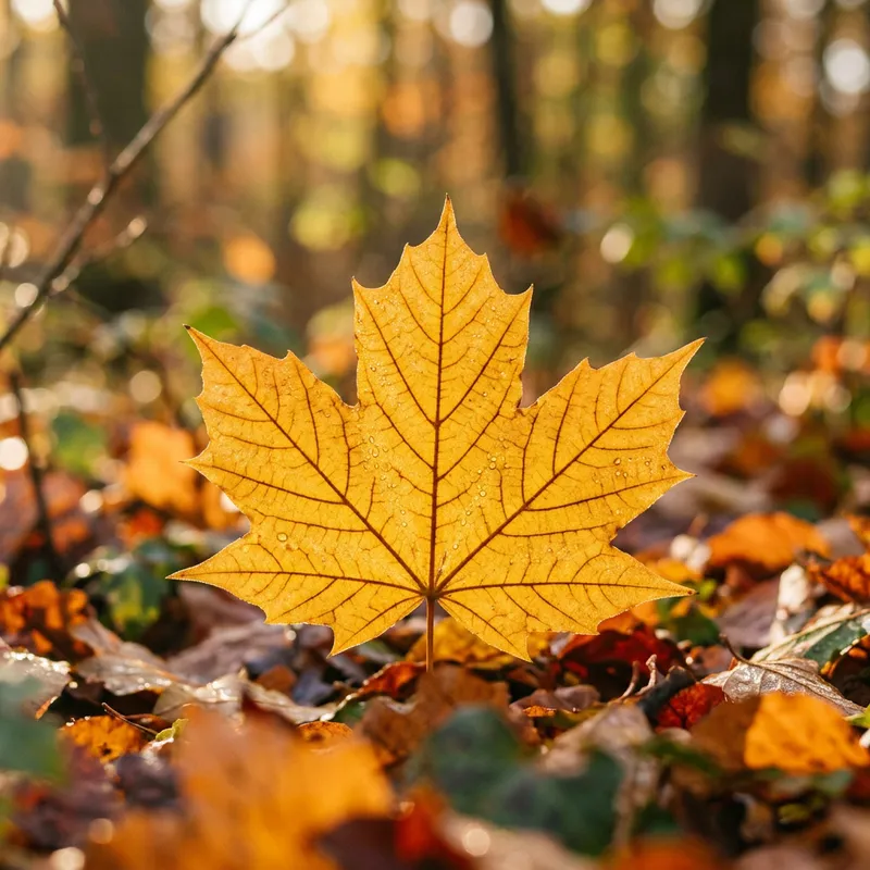 A photo of a golden leaf, glistening under the soft autumn sunlight. The leaf is perfectly shaped, with sharply defined veins spreading to the edges, emphasizing its intrinsic beauty.