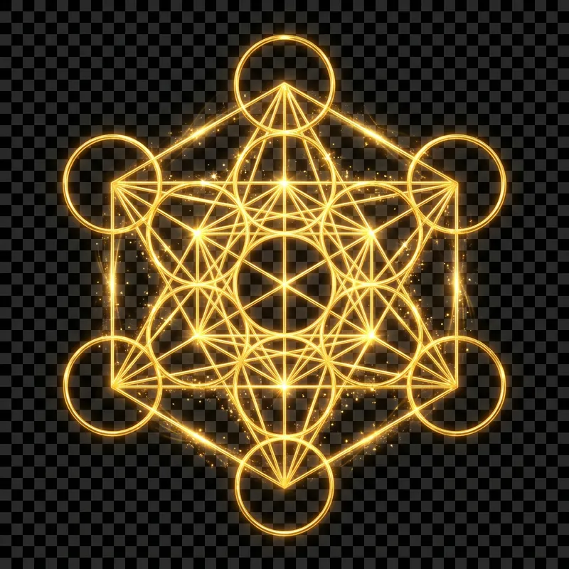 A golden Metatron's Cube, a sacred geometrical symbol, beautifully illuminated in a radiant gold color against a transparent background, shining and reflecting light in various directions. This symbol, traditionally known as Metatron's Cube, consists of thirteen circles with lines extending from the center to connect every other circle, creating an intricate and symmetrical pattern.