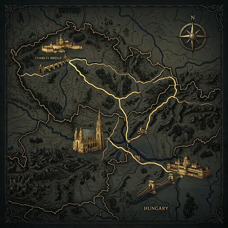 Generate a dark-colored map detailing a motorcycle travel and adventure route originating from Bratislava, proceeding to Prague, then Vienna, then Budapest, and finally returning to Bratislava. The route should be represented with a golden path. At each stop, depict the most recognizable landmark of the city, but do not include any text on the image.