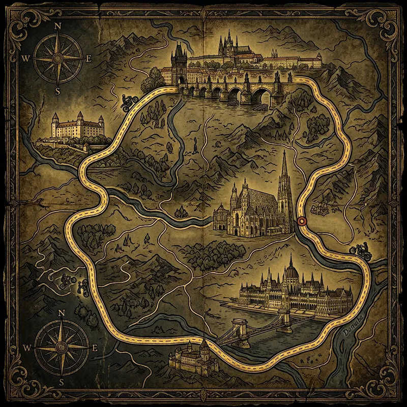 Generate an image of a dark, parchment-like map with golden roads, leading in a circular path starting and ending in Bratislava, with stops in Prague, Vienna, and Budapest in between. Each stop on the route is marked by the most recognizable landmark of that city. Make it suitable for motorcyclists to clearly identify the route. The landmarks and roads should be the only depictions, with no text on the map.