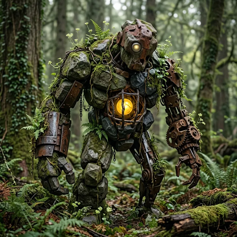 A deformed golem, neutral in demeanor, made of metal and rocks adorned with vegetation. At its core, there is a yellow nucleus.