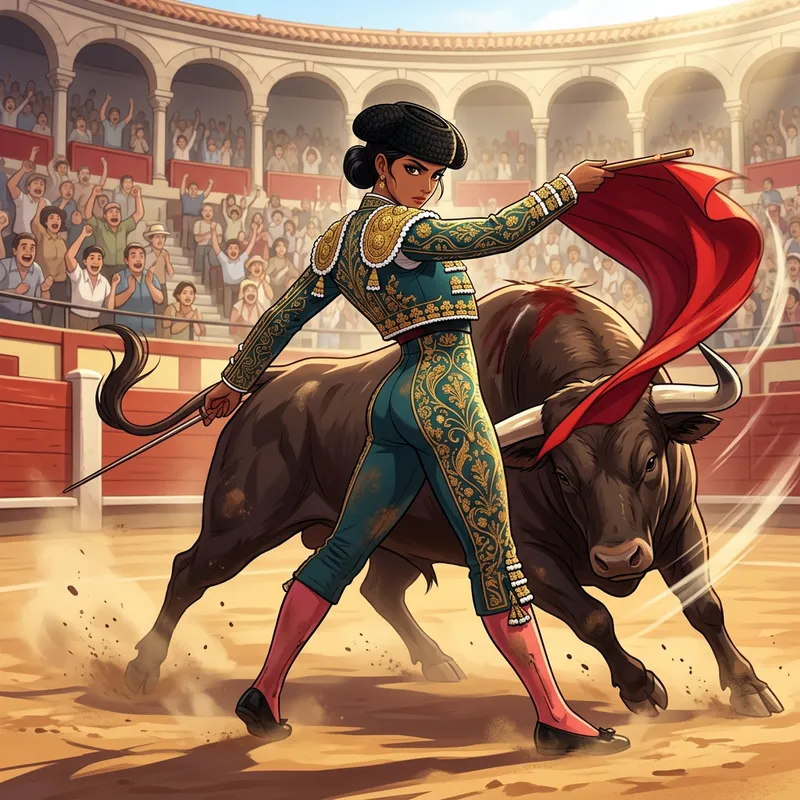 A large, powerful bull inside a bullfighting arena. Commanding the center stage is a South Asian female matador. She is athletic and elegant, skillfully guiding the bull's movements with her vibrant cape. Her actions, precise and calculated, leave the onlookers in awe. She bends her back slightly to maintain balance and her strong legs provide a solid stance. This image is drawn in anime style.
