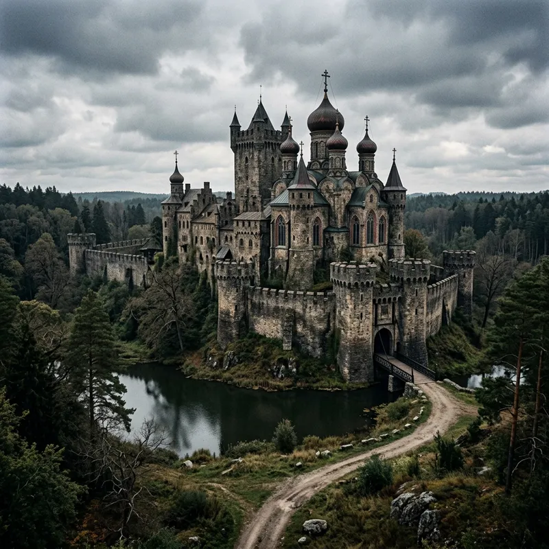 A gothic-style castle situated in a hauntingly serene landscape. The castle exhibits an architectural fusion, featuring multiple onion domes which are typical of traditional Russian buildings. Stone walls etched with years of aging extend towards the overcast sky, and arched windows peek out from the structure's thick body. Distant trees surround the imposing fortress, offering seclusion and mystery.