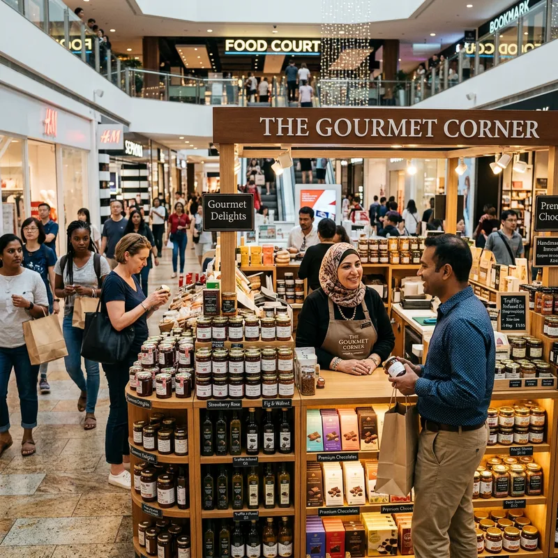An interior scene presenting a small kiosk placed inside a bustling shopping mall. The stand is abundant with gourmet products attractively displayed. Shelves are filled with jars of artisanal jams, truffle-infused oils, and premium chocolates. Patrons of various nationalities are browsing the products. The kiosk owner, a Middle-Eastern female, is pleasantly conversing with a male customer who appears to be of South Asian descent. Bright mall lights illuminate the space, adding a warm glow to the high-quality products on display. The ambiance is lively, reflecting the hustle and bustle of a busy shopping day.