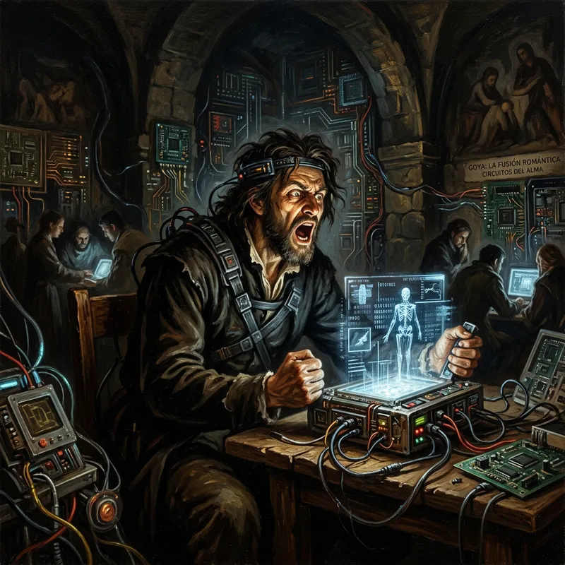 Merge the paintings of Goya emblematic of the Romantic movement with elements of modern technology. Imagine a scene where the emotional intensity and dramatic play of light and shadow characteristic of Goya's works meet circuit boards, futuristic devices, and digitized elements. This fusion should represent an oil painting in Goya's style, where millennia-old traditions meet the cutting-edge advancements of today's world.