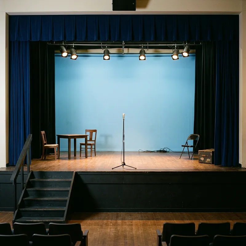 A basic setup of a stage for a play or concert. The stage has simple, unadorned black steps leading up to it and a plain brown wood floor. There are generic spotlights positioned overhead, casting a warm, golden light onto the stage area. A basic microphone on a stand is at the center, ready for a speaker or performer. Various props like chairs and tables are arranged in a non-specific layout, ready to be moved according to scene requirements. The stage curtains are drawn open, and the backdrop is a basic sky-blue color, evoking a neutral or day scene.