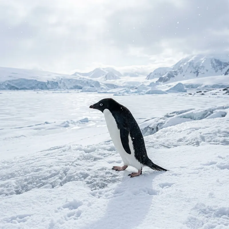 Capture of a penguin gracefully waddling on a vast, icy terrain bathed in shimmering white. The chill in the air is almost palpable as flurries of soft snow chill the scenery, the dark figure of the penguin standing out starkly against the expansive icy backdrop. The penguin's sleek black back and stark white belly create a vivid contrast, its tiny, bright eyes gleaming curiously. The frozen landscape, untouched and serene, wraps around this lovely creature, accentuating the simple elegance of its existence in such a harsh environment.