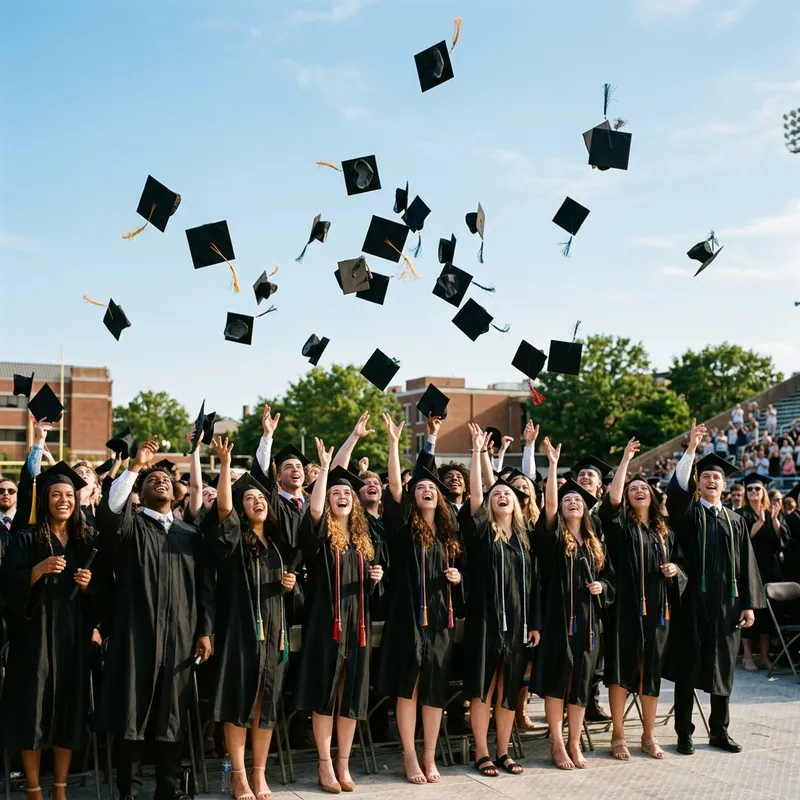 The scene unfolds at a graduation event. You can sense the excitement in the air as many freshly graduated students proudly showcase their cap and gown attire. They stand tall, ready to receive their dipolmas -- a testament to their dedication and hard work. All the graduates exhibiting a wide array of individual styles, yet unanimously united by their black graduation caps, designed with squares at the top commonly known as mortarboards, and their black gowns, flowing and reaching their ankles. Above their heads, you see caps being thrown in jubilation, rocketing towards the clear blue sky.