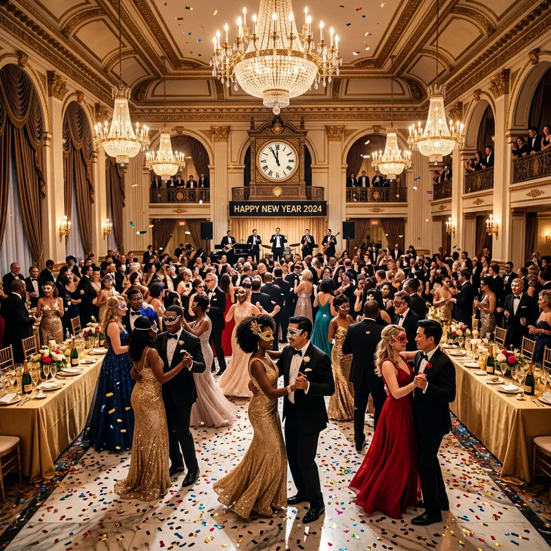 Imagine a grand ballroom set for a New Year's Eve masquerade party. Extravagant chandeliers are hanging from the ceiling, casting a warm, golden glow over the room. Multicolored confetti is scattered on the marble floor. Tables decorated with golden linen and glasses filled with bubbly champagne line the sides. In the middle, a crowd of people, each of diverse descent such as Caucasian, Black, Hispanic, and so on, with the equal proportion are dancing. Everyone is elegantly dressed in gowns and suits, each wearing a unique mask that conceals their identity. Somewhere a clock is about to strike midnight.