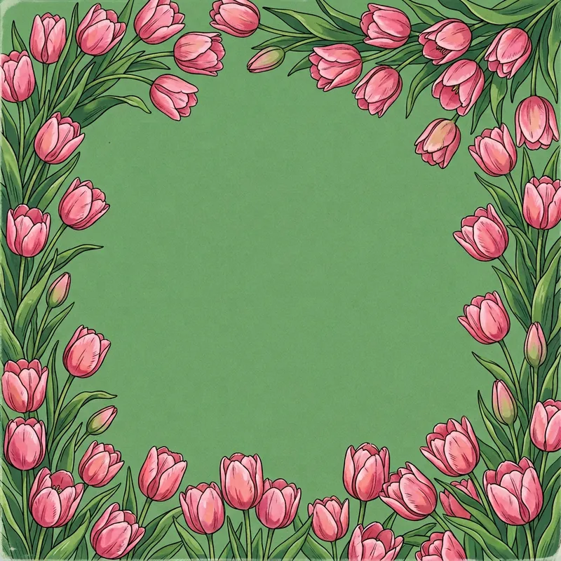 An image drawn in a classic 1990s anime style. The background of the image should be plain green. In the middle of the image, there is abundant open space. The edges of the image should not be empty though, here pink tulips bloom generously, circling around the frame. The tulips are lovingly detailed, their vibrant pink petals beautifully contrast with the green background.