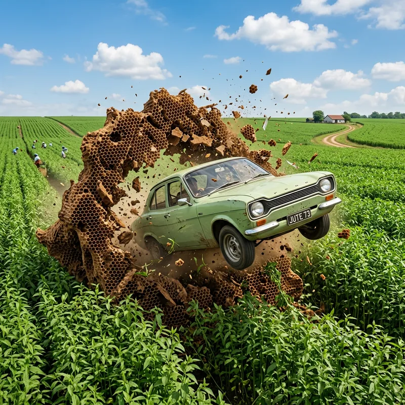 A pale green car bursting out of a brown honeycomb structure, with the brown honeycomb structure emerging from a green jute plantation. The background is a vibrant blue sky.