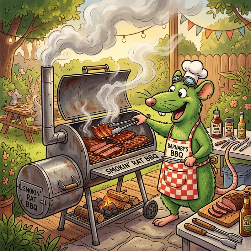 green cartoon rat smokin meat on a barbeque.
