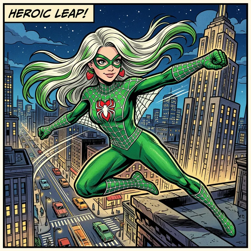 Imagine a comic book panel rendered in the broad style reminiscent of mid-century American graphic novels. It features a Caucasian teenage girl having delicate features with soft grayish-green eyes. Her hair, blonde to an almost white degree, is silky and long, with some strands dyed a vivid green. The girl's outfit is quite distinctive, a vibrantly green suit intricately patterned with white spider webs. A stylized heart-shaped spider emblem adorns the suit's chest area. She further accents her look with earrings, each whimsically shaped like a strawberry. She strikes an inspiring pose, providing a heroic aesthetic to her overall appearance.