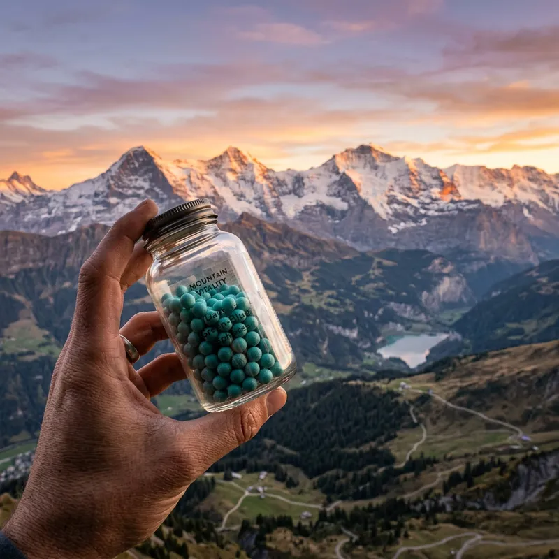 Visualize a hand, regardless of gender or descent, holding a transparent glass bottle filled with greenish-blue supplement pills. The pills are spherical in shape and are illuminated by the soft light that is present. The background paints an elaborate picture of a gorgeous mountain range. The peaks of these mountains are shrouded in snow, and they stand majestically under a bright, clear sky. The sun is either rising or setting, which casts a beautiful orange and purple hue across the sky.