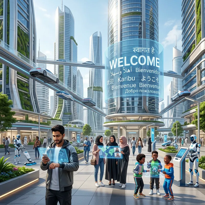 Envision an urbanized future where high-tech skyscrapers fill the skyline, glinting under the gleaming sun. Hover cars dot the air, moving swiftly among the towering structures. A large digital billboard illuminate the scene, displaying welcome in myriad languages to illustrate the unity of diverse cultures. Robots on the ground, with human-like features and glowing blue eyes, are in the middle of their routine tasks. Diverse groups of people, South Asian men, Middle-Eastern women and black children are seen in contemporary fashion, engrossed in their holographic interfaces, exemplifying life in this futuristic age.
